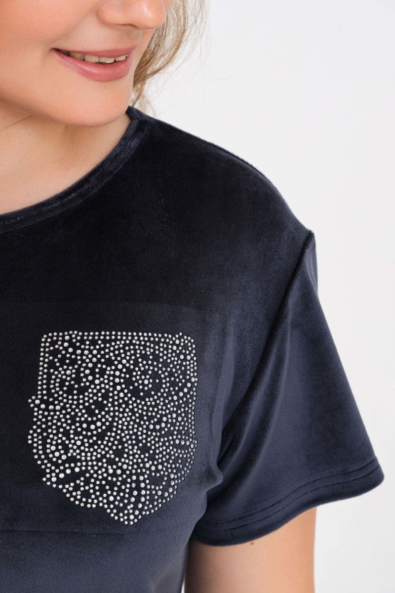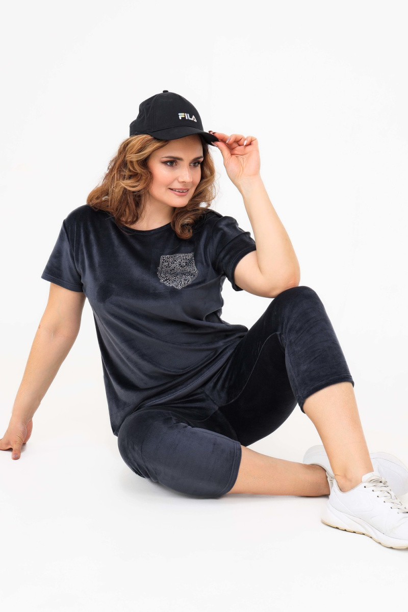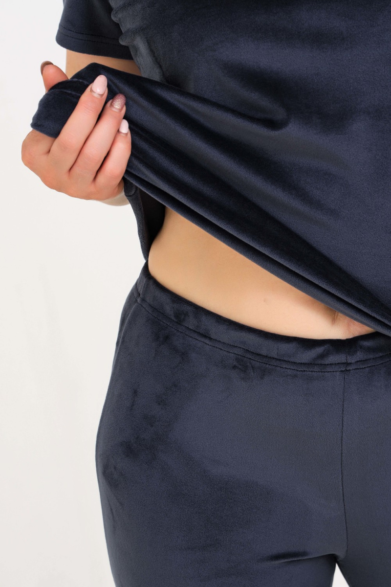 Костюм женский из велюра. В комплект входят:- футболка с коротким рукавом с округлым вырезом горловины и леггинсы. Мягкий трикотажный комплект для женщин Российского производства. Стильный костюм из стрейч - велюра для женщин представлен в широкой размерной сетке: от маленького 42 размера до 52 размера. Удобный домашний велюровый комплект не сковывает движений, что делает его универсальной одеждой, которая подойдет на любую фигуру как для худеньких, стройных, так и для пышных девушек и женщин. Костюм двойка женский подходит на любой рост: для высоких и для невысоких. Однотонный костюм с шортами выполнен в спокойных и практичных темных тонах. Бархатный комплект из трикотажной ткани не сковывает движения, скрывает недостатки и подчеркивает достоинства фигуры. Костюм из велюра не мнется, не дает усадку после стирок, не теряет цвет, сохраняет форму и внешний вид. Молодежный комплект подходит для девочек, подростков, молодых женщин, а также для женщин любого возраста, желающих модно выглядеть в домашней обстановке