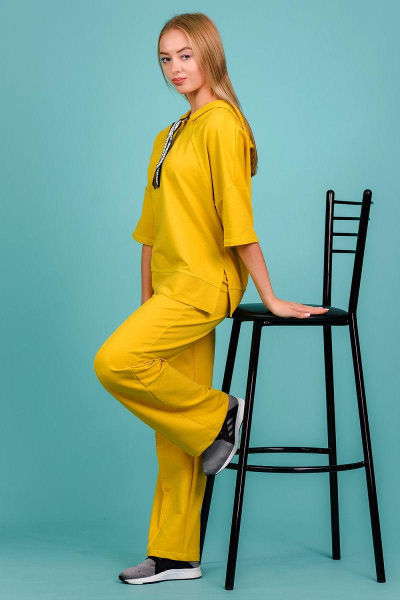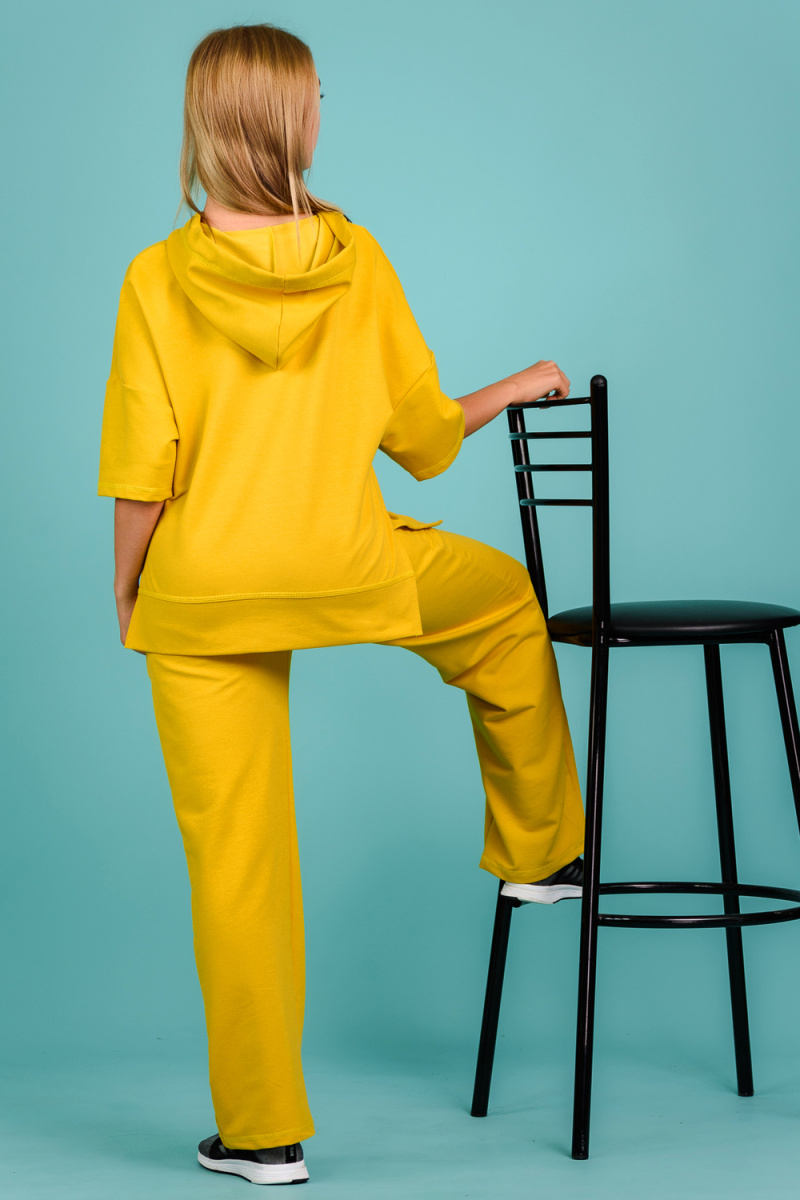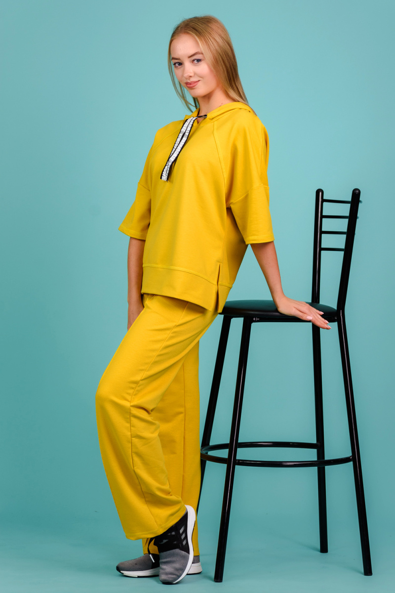 Костюм состоит из толстовки и брюк. Толстовка прямая, свободная, с капюшоном, с коротким рукавом. На полочке расположены симметричные фигурные кокетки. В нижней части боковых швов обработаны разрезы. Низ полочки и спинки завершены поясом. Брюки свободные, прямые, со стрелками, с карманами, на поясе.