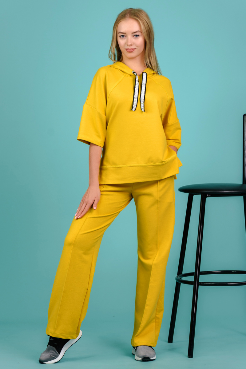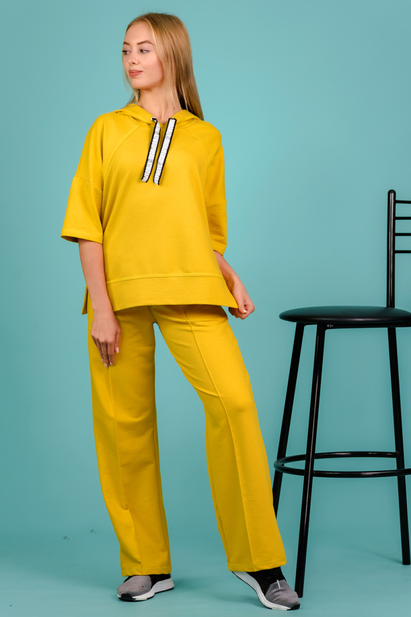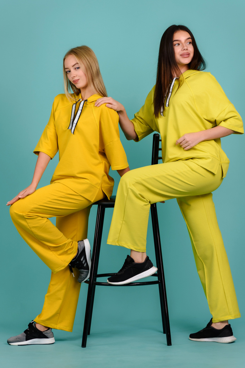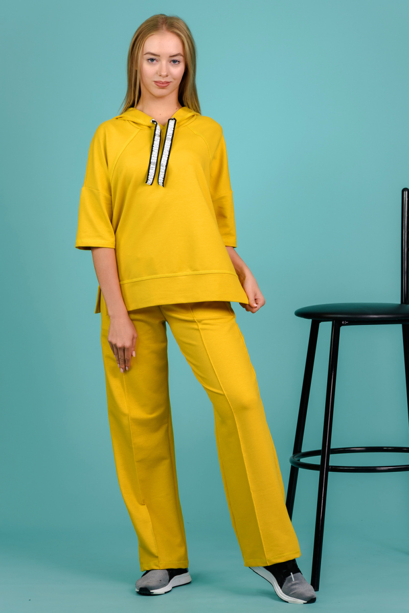 Костюм состоит из толстовки и брюк. Толстовка прямая, свободная, с капюшоном, с коротким рукавом. На полочке расположены симметричные фигурные кокетки. В нижней части боковых швов обработаны разрезы. Низ полочки и спинки завершены поясом. Брюки свободные, прямые, со стрелками, с карманами, на поясе.