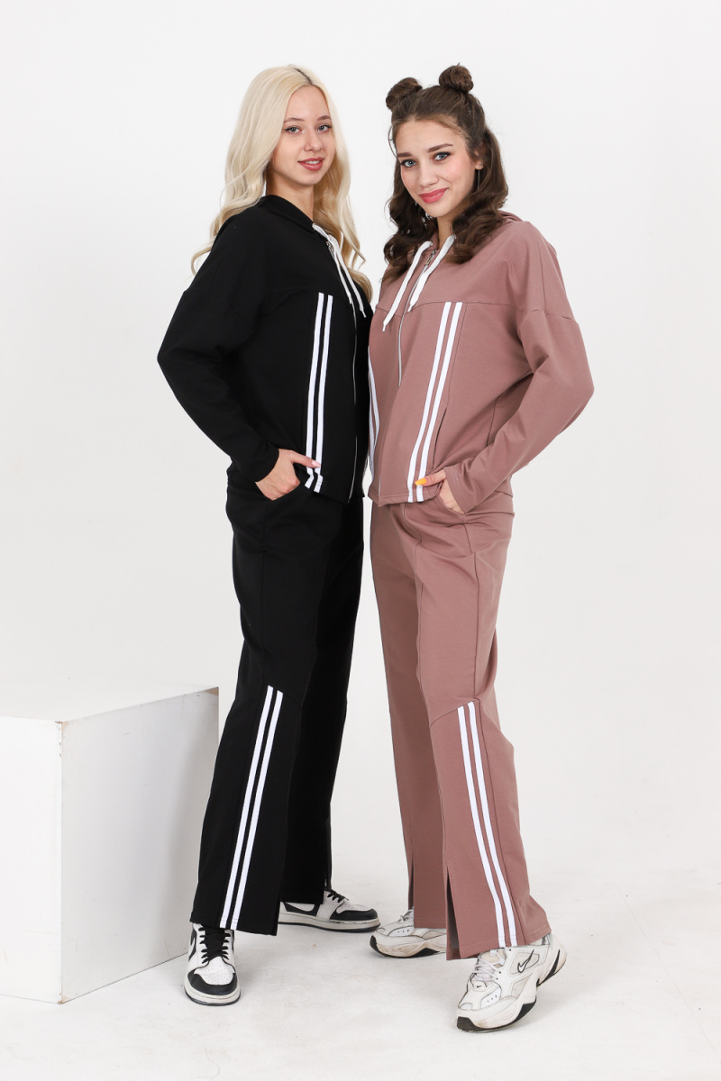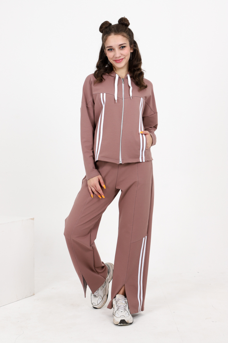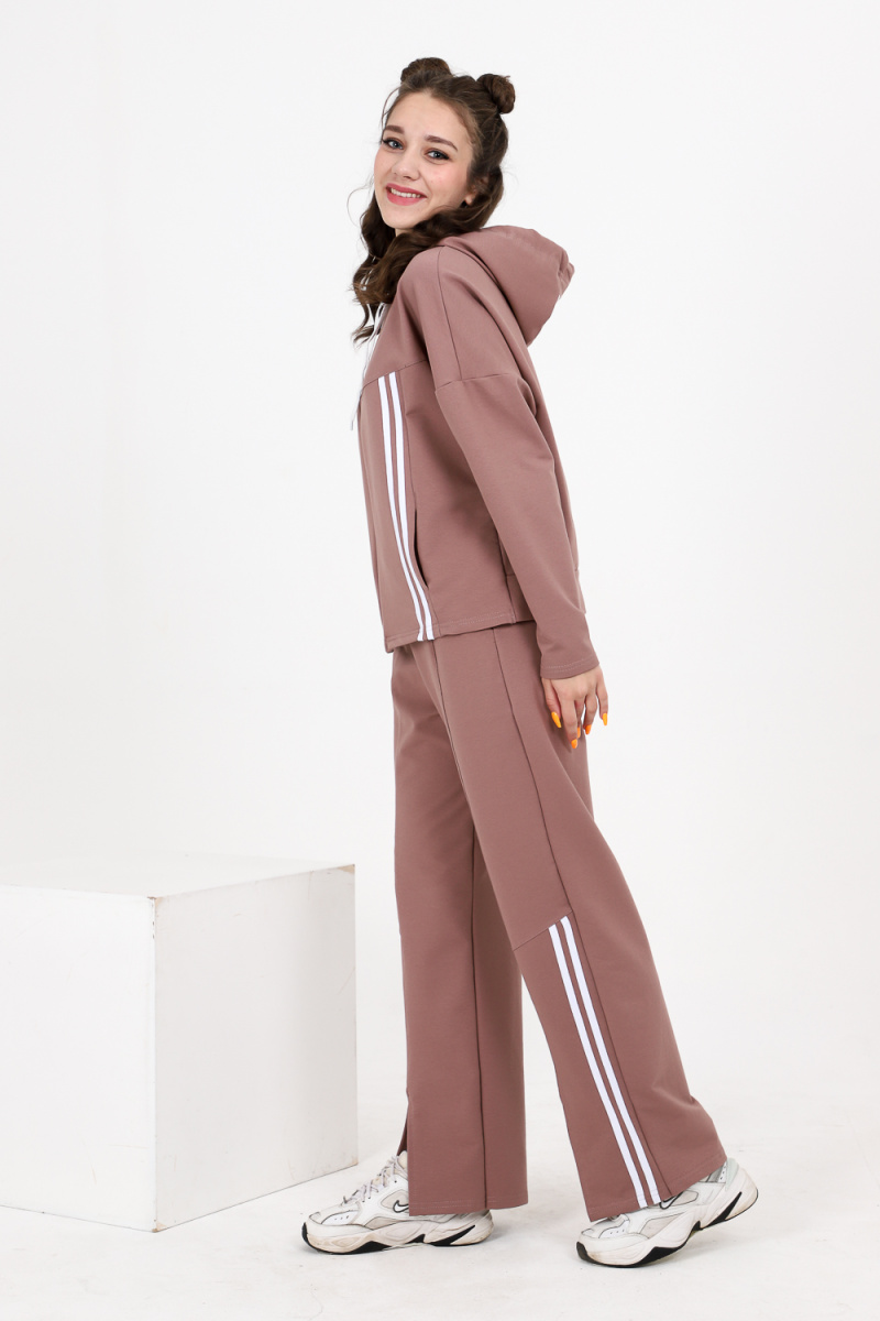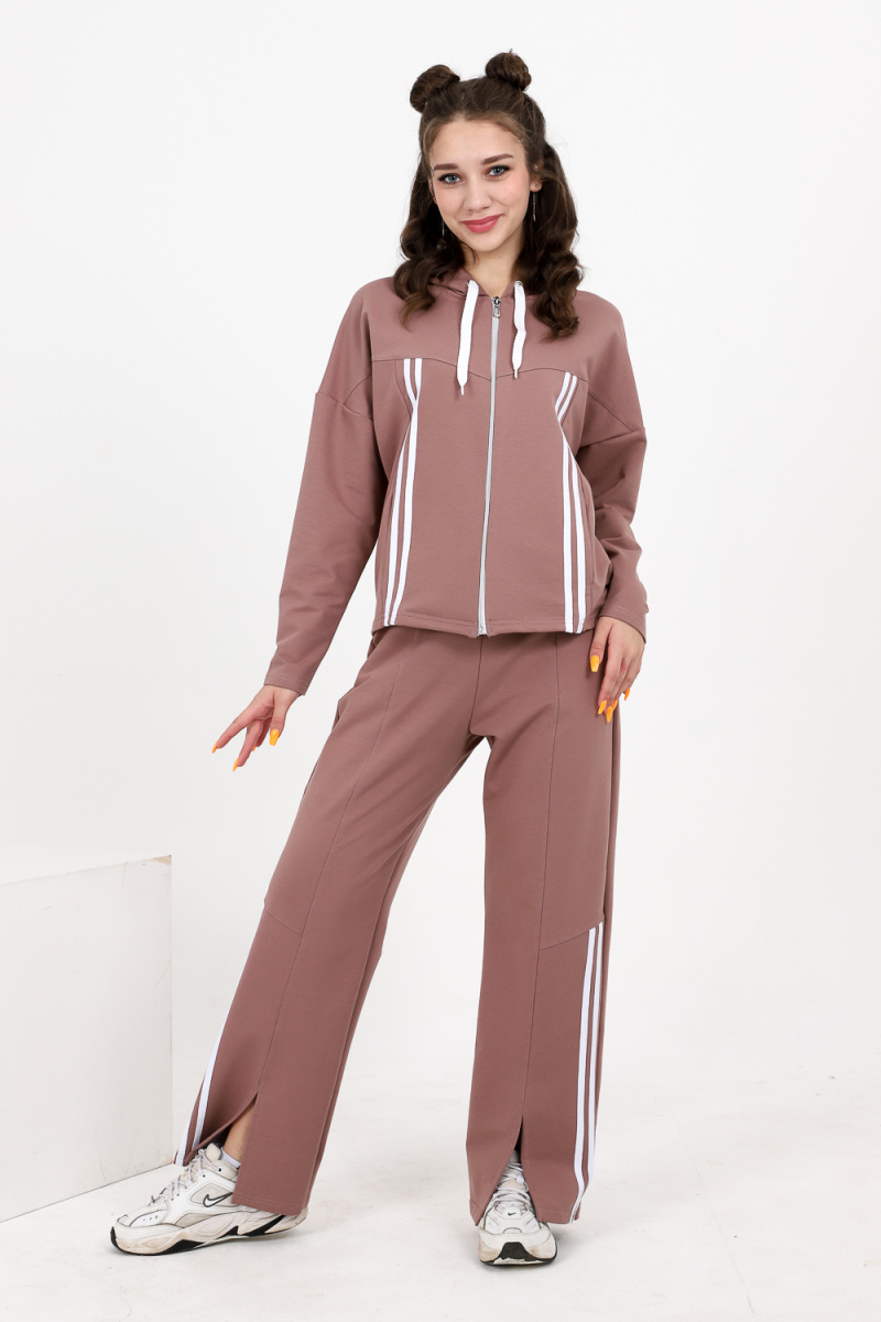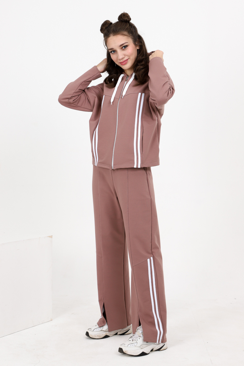 Костюм состоит из толстовки и брюк. Толстовка прямая, свободная, с капюшоном, на молнии. Полочка с кокетками и вертикальными рельефами. В рельефных швах обработаны карманы. Рукав длинный. Низ спинки обработан поясом. Брюки свободные, прямые, с боковыми карманами, на поясе. В нижней части передних половинок брюк обработаны разрезы.