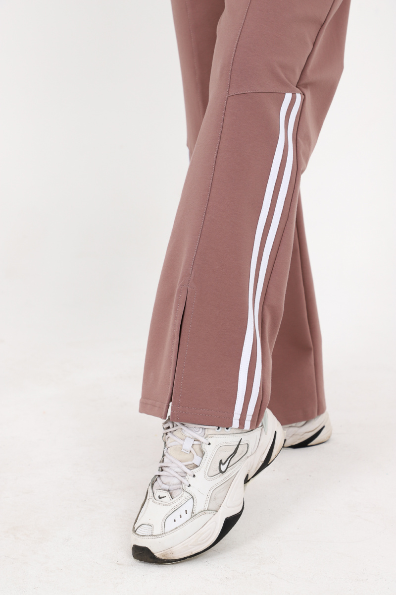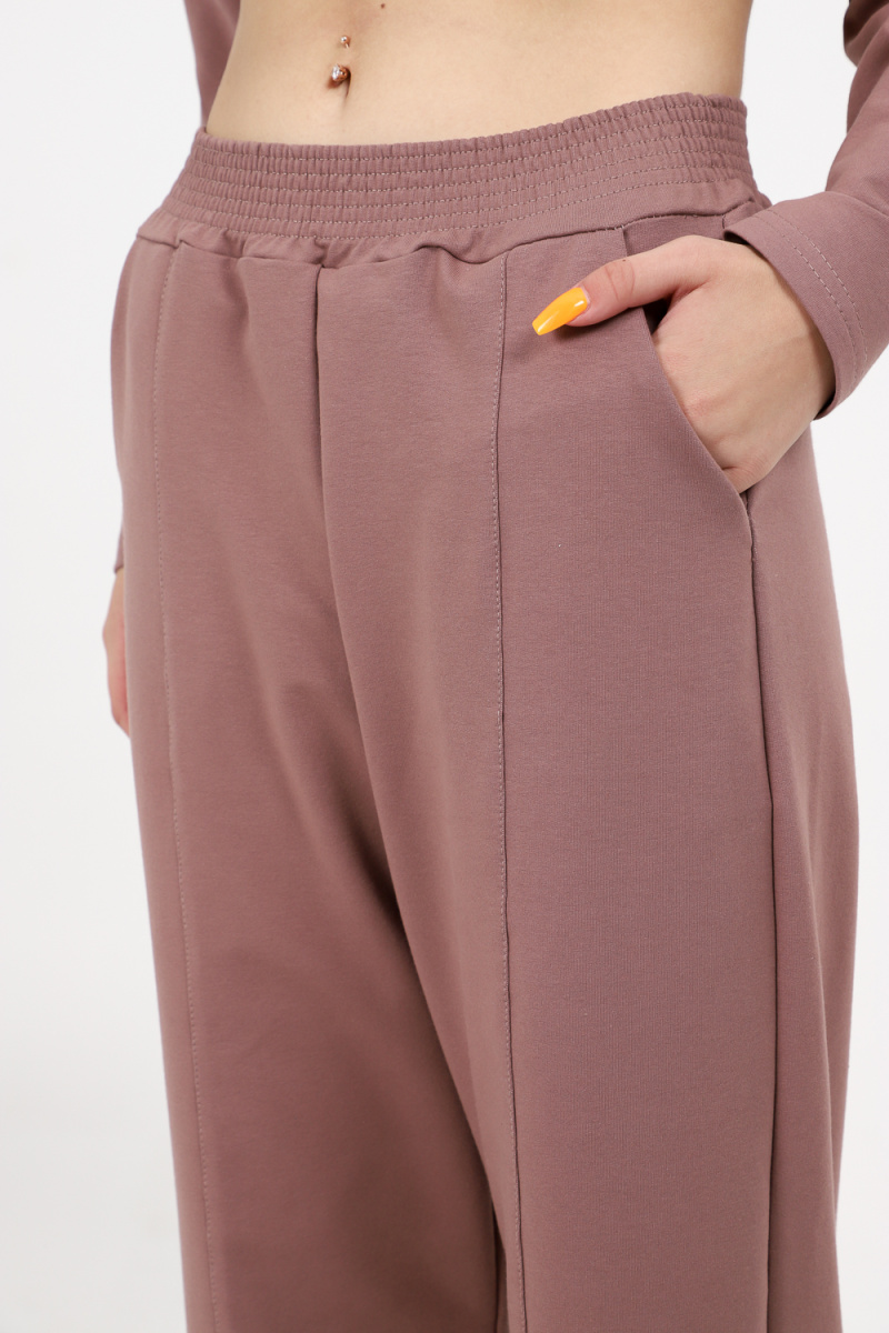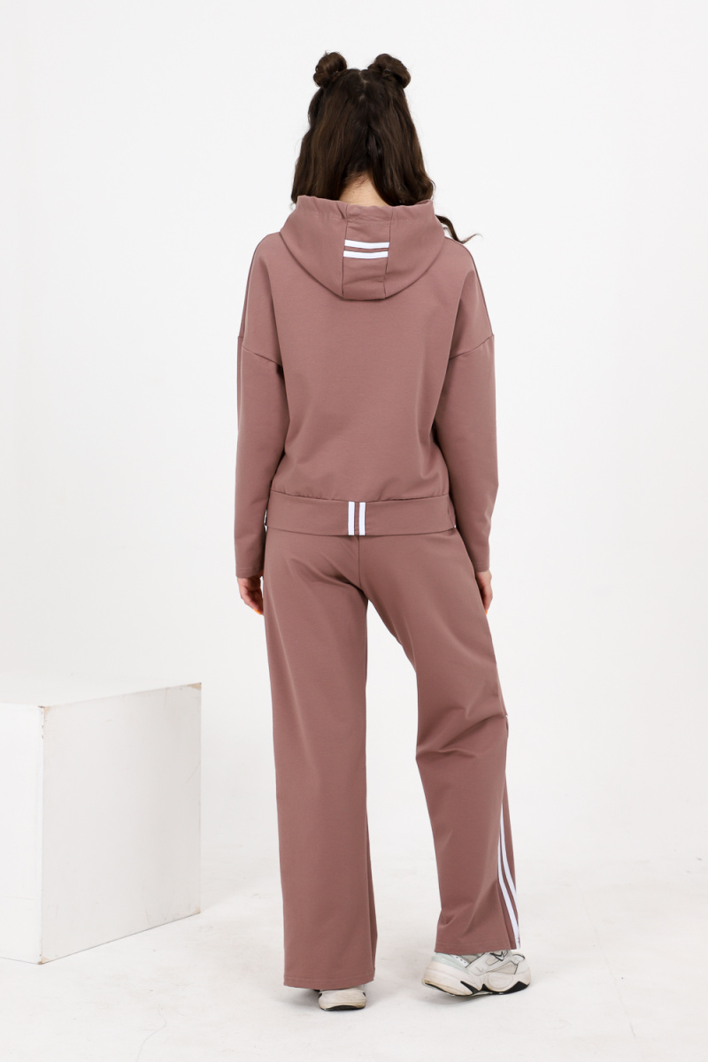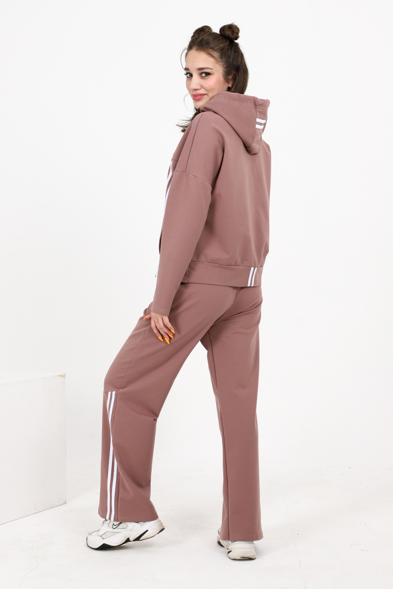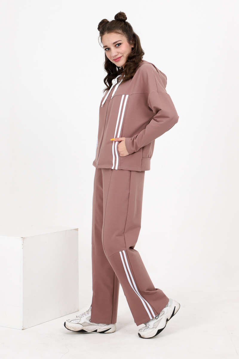 Костюм состоит из толстовки и брюк. Толстовка прямая, свободная, с капюшоном, на молнии. Полочка с кокетками и вертикальными рельефами. В рельефных швах обработаны карманы. Рукав длинный. Низ спинки обработан поясом. Брюки свободные, прямые, с боковыми карманами, на поясе. В нижней части передних половинок брюк обработаны разрезы.